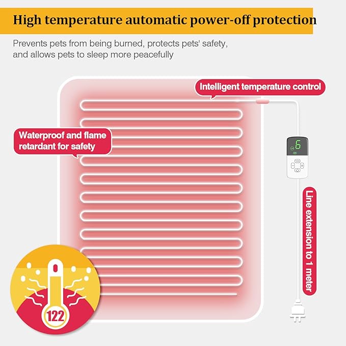 - 【Temperature &Timer Adjustable Function】Control the temperature of the electric dog heating pad through the LED controller, you can easily adjust the temperature, there are 9 temperature settings (86-122℉/30-50℃) to suit your pet. The Dog Heating Pad with Timer automatically shuts off in 2 to 12 hours, saving energy and preventing burns from overheating.