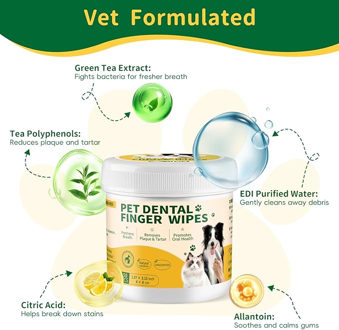 - Vet Recommended Oral Care Solution:Developed to support the kind of daily dental care veterinarians recommend, these pet dental finger wipes make it simple to clean your pet’s mouth at home. Regular wiping helps reduce plaque buildup and maintain gum health — no brushing stress or harsh chemicals needed.