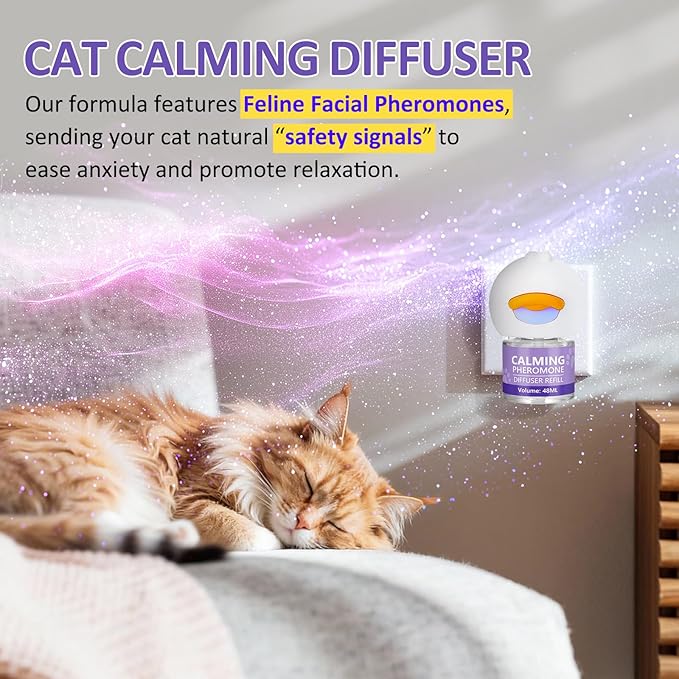 - 【Pheromones for Cats Refill】The cat pheromones calming diffuser is ideal for soothing cats. This cat diffuser has broad coverage and provides superior, longer-lasting pheromones for cats delivery. The cat pheromone diffuser helps reduce common signs of stress and can relieve daily cat stress, scratching, and tension. For comprehensive cat stress relief, multiple cat calming diffuser units may be needed in homes with multiple rooms.