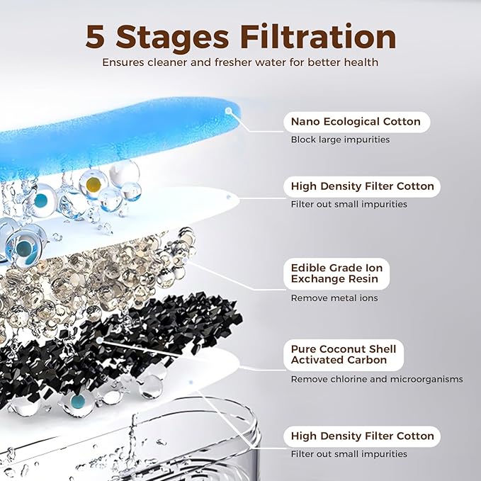 - 【5-Stage Filtration System】: The filter of the cat water fountain is composed of activated carbon and ion resin, nano-ecological cotton, and high-density filter cotton, forming a 5-stage filtration system. It removes odors and softens water while also absorbing pet hair, dust, and other fine particles, providing pure and healthy drinking water for your cat.
