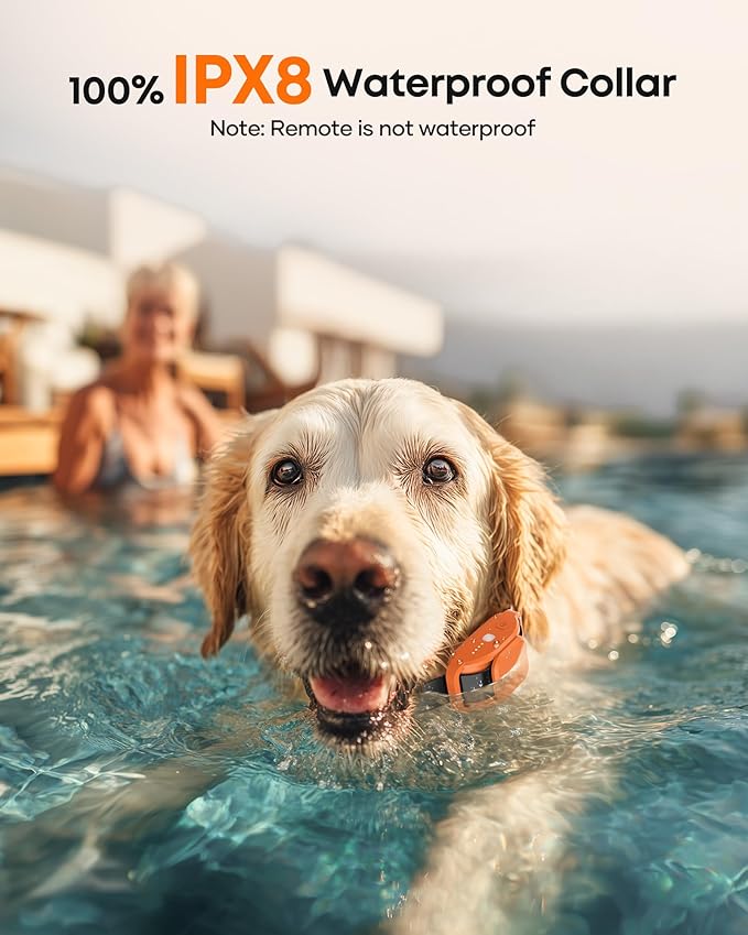 - [IPX8 Waterproof Collar & Enhanced Safety] This electric dog collar is IPX8 waterproof, making it perfect for any weather—rain, mud, or water—ideal for training and outdoor adventures. The remote includes a safety lock and switch button for quick response, preventing accidental activation. The shock collar for dogs also features a built-in LED light for nighttime safety