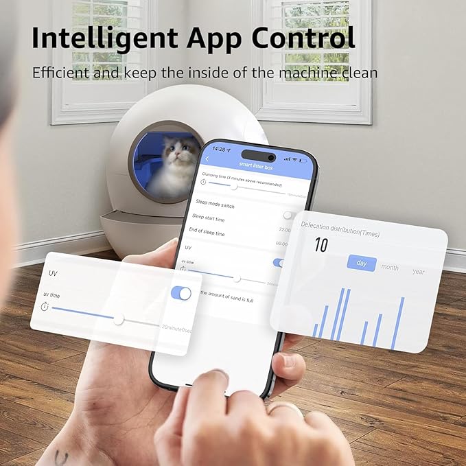 - SMART SAFETY SENSORS: Building with double protection system. When the pet approaches the litter box, the sensor will detect sensitively, and the machine will automatically stop working to protect the pet's safety. kitty litter box will also sync data to your phone so you can monitor the cat's health at any time.