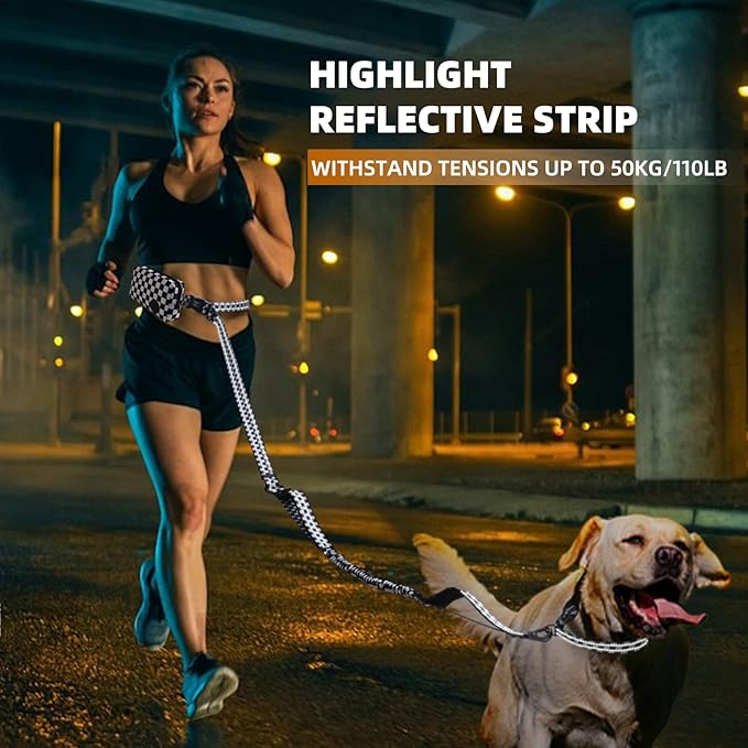 - 【Dual Handles Better Control】New ADDED SECOND HANDLE, lower handle for quick-response training, busy streets, traffic safety, or sudden stops. Upper handle for relaxed walks and used as a regular puppy leash. 360° swivel clip prevents tangles allows your dog to get enough freedom. Reflective stitch across entire handsfree leash to provide greater nighttime visibility, make sure to walk or run safely with your dog at night!