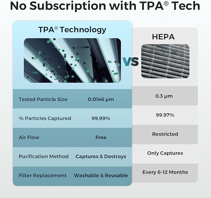 - Washable, Reusable Filter (No Subscriptions): Unlike HEPA filters that require frequent and costly replacements, our innovative graphene filter is durable ,reusable and completely washable. Simply rinse and reuse.