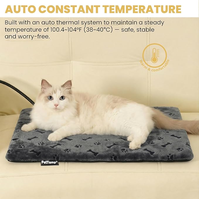 - 【Auto Constant Temperature & Low-Energy System】 Equipped with a dual thermostat and built-in temperature sensor, the pad automatically maintains an optimal comfort range of about 100–104 °F (38–40 °C). Just plug it in and let your pet enjoy safe, stable warmth all day, while the low-energy design helps save power.