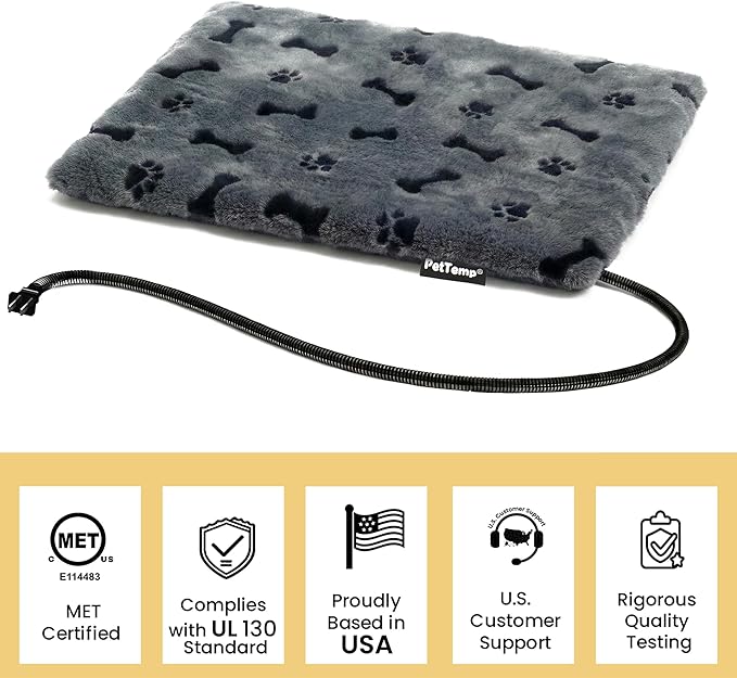 - 【Safe & Certified Design】 Your pet’s safety is our top priority. The pad features an 8-layer protective structure with UL-approved heating wire and MET safety certification for the entire unit—not just the components. A temperature sensor and automatic shut-off function help prevent overheating, while the chew-resistant cord and waterproof, flame-retardant PVC layer provide long-lasting protection.