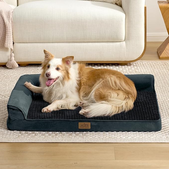 - L Shaped Dog Bed: The COZY KISS orthopedic dog bed helps distribute weight evenly, providing optimal pressure relief and joint support. It is particularly beneficial for senior pets, large dogs, or those with arthritis. Please note: Due to vacuum compression, the bed requires 24-48 hours to fully expand to its original shape, the inner lining helps to prevent liquid penetration into foam, but the soft plush outer layer itself is not waterproof