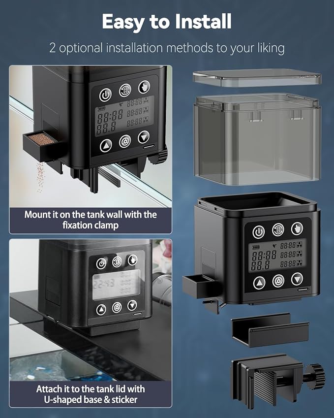 - 2 Installation Methods: Just fix the automatic fish feeder for aquariums on the tank wall with the fixation clamp, or you can attach it to the tank lid with the U-shaped base and sticker. Super convenient and time-saving with no need for special tools