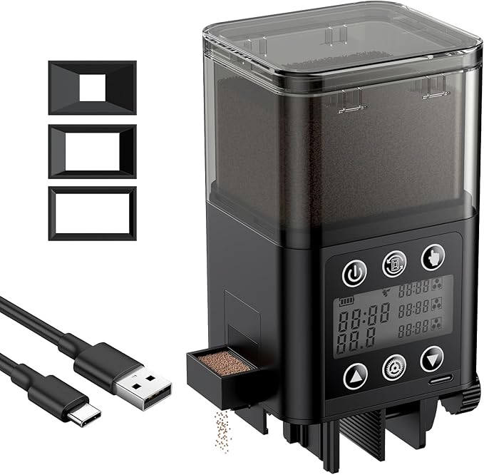 - Perfect Portion Control: Three interchangeable dispensing ports let you customize feeding amounts without hassle – no more overfeeding or wasted food! Switch between ports instantly to match your fish’s appetite