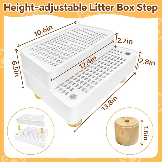 Litter Box Step,2 Steps Litter Box Ramp with Wooden Base,Cat Litter Catcher,Height-Adjustable for Small & Elderly Cats,White