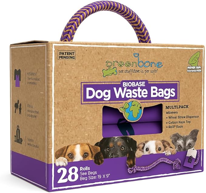 Greenbone BioBase Purple Dog Poop Bag Refills: 28 Rolls - 336 Bags with Dispenser and Rope Toy Handle- Dog Gift Set