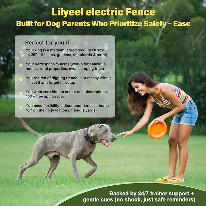 - 【2-in-1 Fence + Trainer: Faster Results, Easier Use】 Lilyeel’s collar pairs APP-controlled electric fences with a handheld remote—so you set boundaries and train first. Use the remote to teach your dog: tones/vibrations mean “head back.” This quick training step ensures the fence works flawlessly later. Stable GPS keeps boundaries reliable; 1-button remote makes training easy, even for new owners. Safe, simple, and ready for worry-free outdoor time.