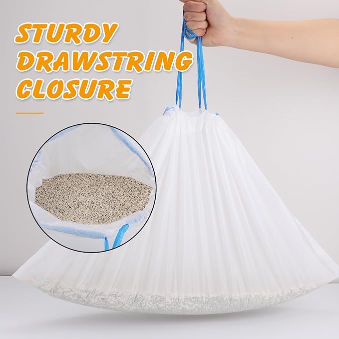 - [Secure Drawstring Closure]Equipped with extra-thick drawstrings for easy lifting and sealing. Dispose of cat litter quickly and touch-free—just pull, tie, and toss for mess-free, odor-locked cleanup.