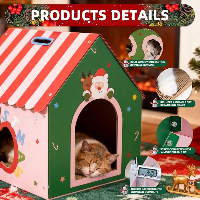 - Christmas Limited Edition: Cat scratching house combines the Christmas red and with classic Christmas elements, such as Christmas apples, santa claus and others, making it more attractive. There are windows on both sides for the cats to look out and play