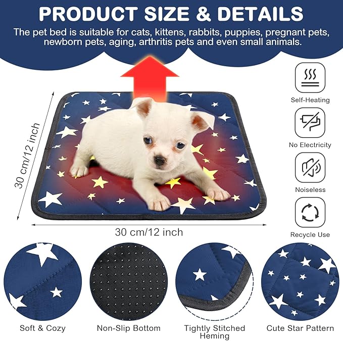 - Product Information: the package includes 4 packs of self warming cat beds with star pattern design, which can attract pets' attention easily; And the size of self heating cat pad is about 12 x 12 inches/ 30 x 30 cm, suitable for puppies, cats, kittens, rabbits, pregnant pets, newborn pets, arthritis pets and even small animals; Please measure your pet to ensure size before ordering