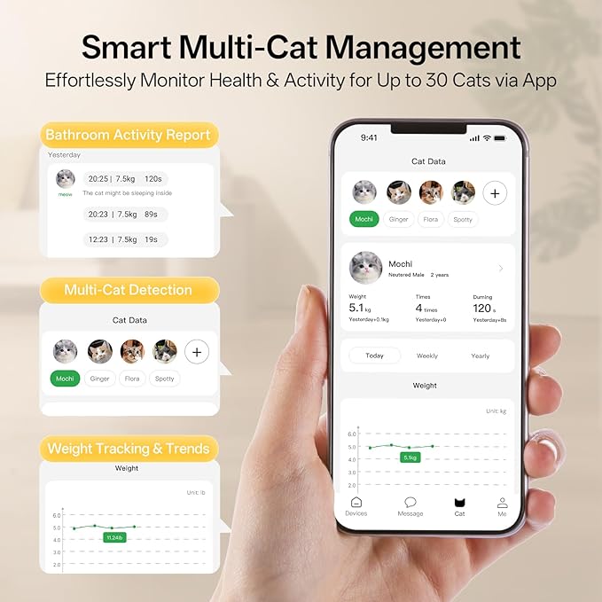 - 🐾 MULTI-CAT SMART APP MANAGEMENT: Remote Control & Real-Time Monitoring - Easily connect via 2.4GHz Wi-Fi to manage your smart litter box remotely from anywhere. Track up to 30+ cats' health data, including bathroom frequency, duration, and weight changes. Get real-time insights into each cat’s habits and travel with peace of mind.