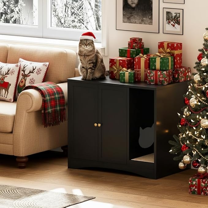 - COMPLETE SOLUTION & SWIFT ASSEMBLY: Receive everything you need for a perfectly tidy and organized cat space right out of the box. This comprehensive hidden litter box cabinet includes two convenient storage hooks for scoopers or waste bags, an integrated exit scraper mat designed to trap stray litter, and two protective corner bumpers for enhanced safety and furniture preservation. With clear, step-by-step instructions and all necessary hardware thoughtfully provided, assembly is remarkably straightforward, typically completed by most customers in just about 30 minutes, allowing your cat to quickly enjoy their comfortable new private space.