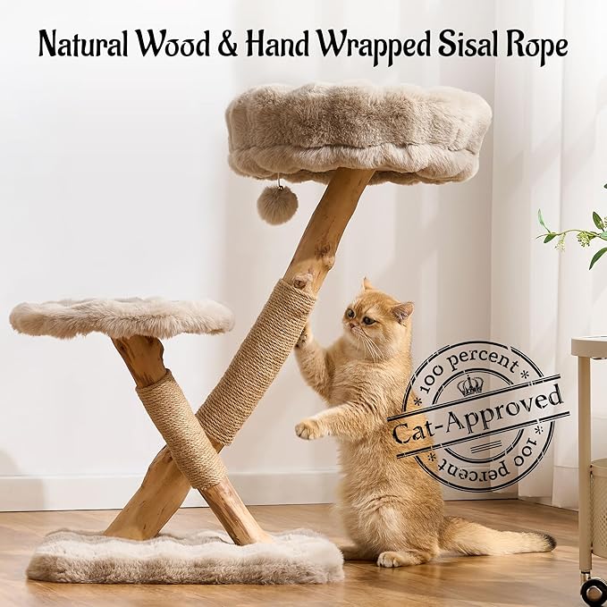 - 【Designer's Notes】 Designed to spark endless feline fun while harmonizing with your home, this X-shaped natural wood cat tree features a plush, luxuriously soft cat bed and perch, bringing a touch of nature indoors while providing a safe, cozy, and stylish retreat