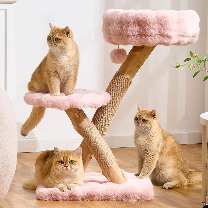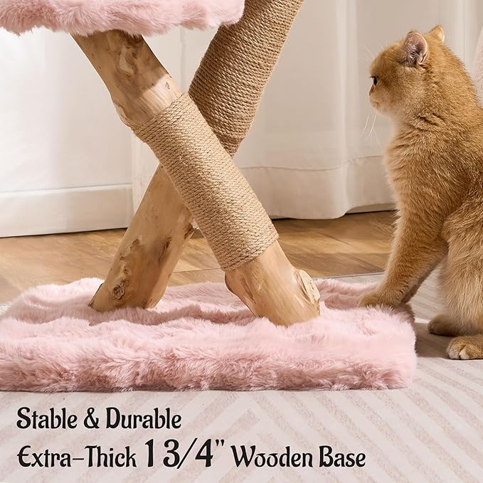 Natural Wood Cat Tree for Indoor Cats Adults, 33in Modern Cat Tree Tower with Super Soft Plush Cat Bed & Perch, Sisal Scratching Posts and Hanging Plush Ball, Sakura Pink