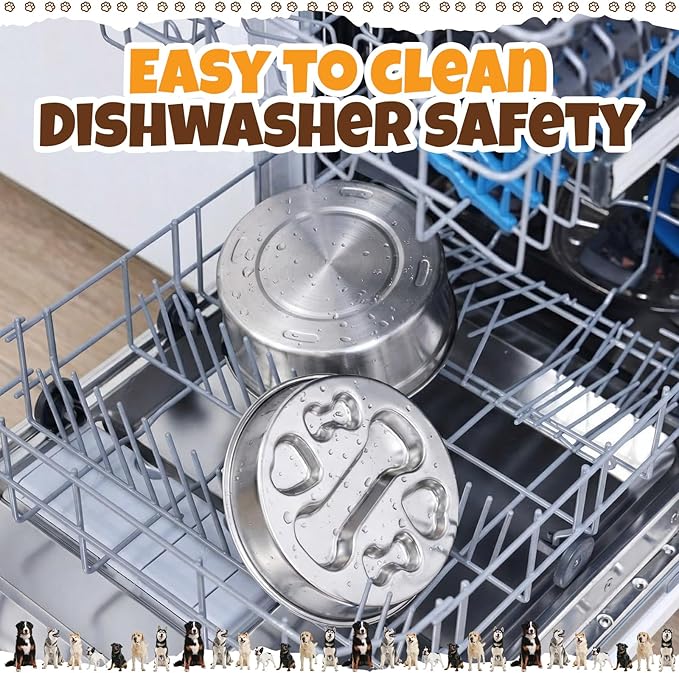 - Quality Material: both the water bowl and slow food bowl are made of stainless steel material, which is safe and durable; They can be washed in the dishwasher, easy to clean, and have no complex parts or difficult to reach corners, saving busy pet owners time and energy