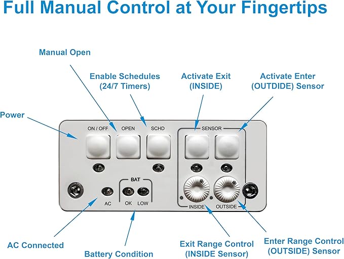 - 4 WAY ACCESS CONTROL: This unique feature gives you seperate Entry and Exit sesnsor controls to let you control your pet's access. Choose from EXIT ONLY, ENTER ONLY, FULL ACCESS and CLOSED and LOCKED.