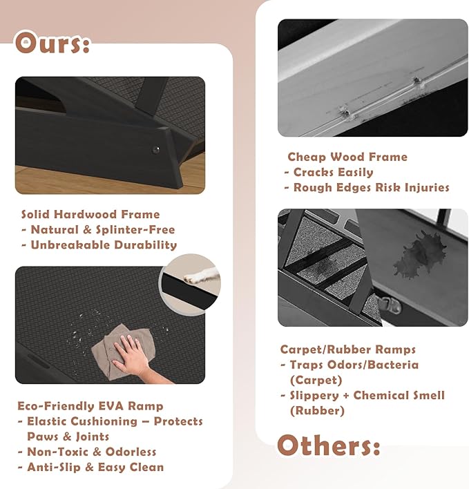 - Secure & Comfortable Dog Bed Ramp The upgraded EVA non-slip surface on this dog bed ramp offers superior traction and gentle joint support for your pet's paws. It's also odor-resistant and easier to clean than rubber or carpet, making it a hygienic choice for any dog ramp for large dogs.