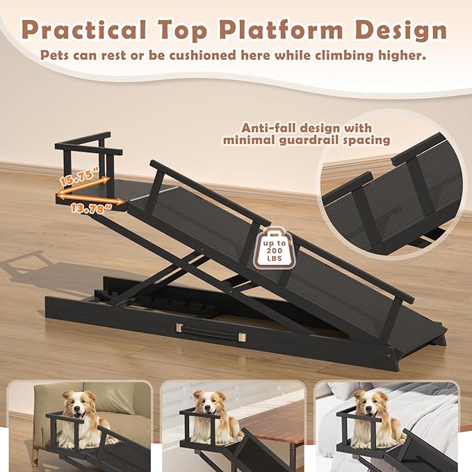 - Unique Rest Platform on Our Dog Ramp for Bed Unlike basic ramps, our dog ramp for bed includes a unique large top platform. This gives your pet a safe place to rest and pause before stepping onto the bed, reducing anxiety and making the adjustable dog ramp easier for them to use.
