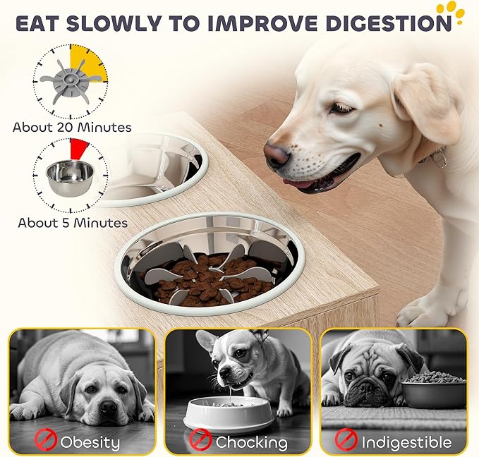 - Slow Feed Safety Details: The slow feeder mat and anti-slip ring of this dog bowl stand help prevent gulping, ensuring a calmer and safer feeding experience for your dog