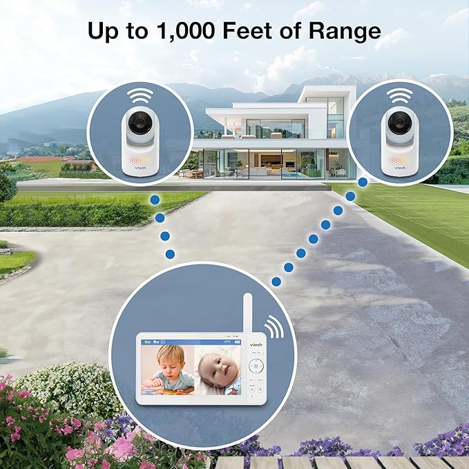 VTech 2-Cameras Video Baby Monitor with 7" Color LCD Screen, Rechargeable Battery, Video and Audio Streaming, Pan-Tilt-Zoom, Touch Multi-Color Night Light, Two-Way Talk: Advanced Max Twin (Blue)