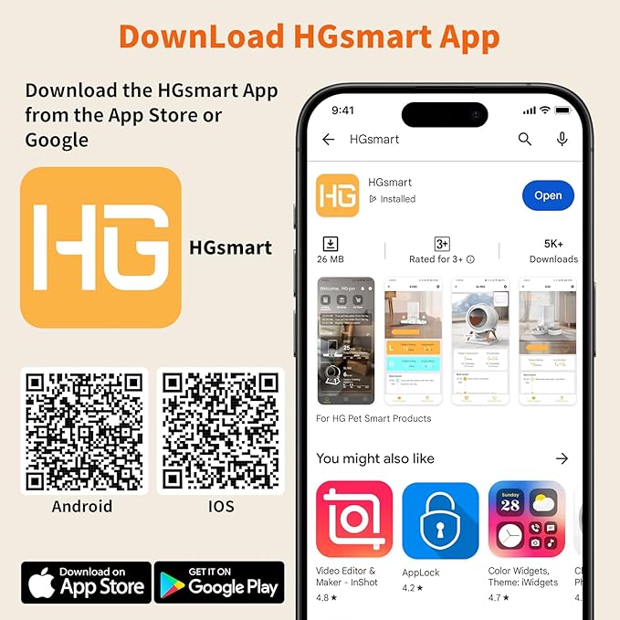 - 📱 Remote Control Via App: Manage your pet’s feeding schedule easily with the "HGsmart" app (iOS/Android)—no complicated buttons needed! Just connect the feeder to dual-band Wi-Fi (2.4GHz/5GHz) for real-time monitoring from anywhere. With the app, you can: 1️⃣ Track daily feeding records. 2️⃣ Monitor desiccant remaining time—no more worries about food spoilage affecting your pet’s health. 3️⃣ Check remaining food portions to refill promptly, avoiding shortages while you’re away or traveling. 4️⃣ Adjust feeding plans anytime. 🐾Plus, if your furry friend deserves a reward, tap "Extra Feeding" in the app to give them a bonus meal. We’re sure this’ll strengthen your bond with your cat!