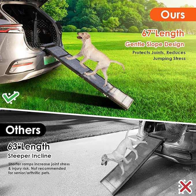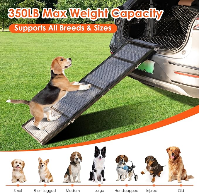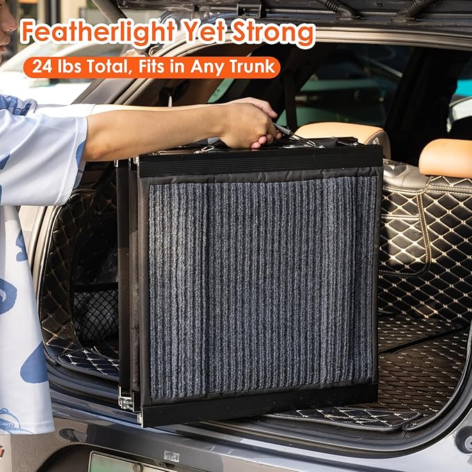 - Portable Foldable Design: Weighing only 22.05lb, this foldable dog ramp is compact for easy storage in car trunks or indoor spaces, ideal for travel and daily use