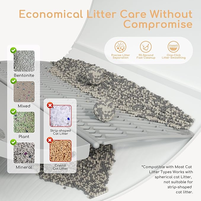- 🐾Smart Litter Saving – Use Less, Clean Less.🐾 Works with most spherical clumping litter. Our precise separation system reduces waste by 30%+ and the raised pedal and edge guard help stop scatter—keeping floors tidy and saving money.
