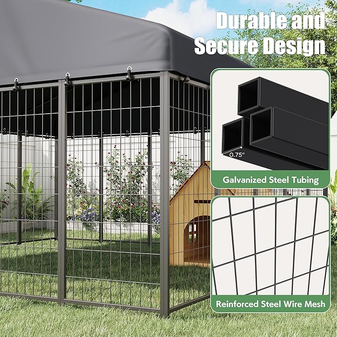 - Heavy-Duty & Rust-Resistant Construction: For your pet’s safety and the product’s durability, this heavy duty dog kennel is built with a reinforced heavy-duty steel frame (0.75" diameter) and thickened 0.12"/3mm wire mesh for extra strength and stability. The entire structure is coated with a rust- and corrosion-resistant finish, ensuring long-lasting use in any outdoor environment