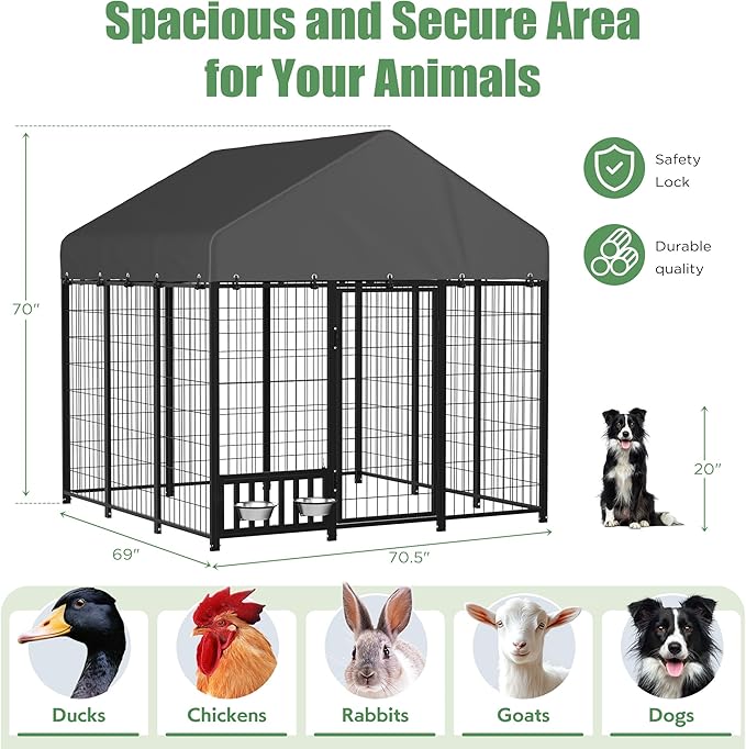 Heavy Duty Outdoor Dog Kennel for Yard, 6x6 Small Steel Chain Link Fence with Roof, Dog Run Enclosure with Feeding Bowl & Self-Locking Latch