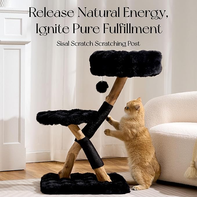 - 🐱100% Real Natural Wood Construction: Expertly crafted from premium European pear wood, this cat tree offers lasting durability and the subtle aroma of a forest. Each post is hand-wrapped in natural sisal rope, providing a safe and satisfying scratching surface.