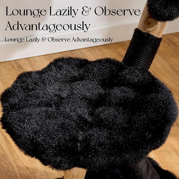Solid Wood Cat Tree, Modern Cat Tree Tower for Large Indoor Cats, Natural Real Pear Wooden Aesthetic Cat Condo with Scratching Post for Adult Kittens-Black