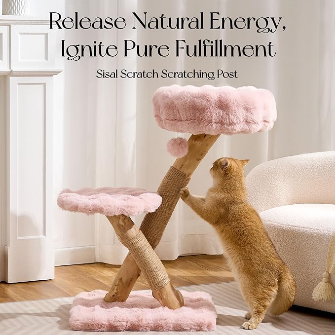 - 🐱100% Real Natural Wood Construction: Expertly crafted from premium European pear wood, this cat tree offers lasting durability and the subtle aroma of a forest. Each post is hand-wrapped in natural sisal rope, providing a safe and satisfying scratching surface.