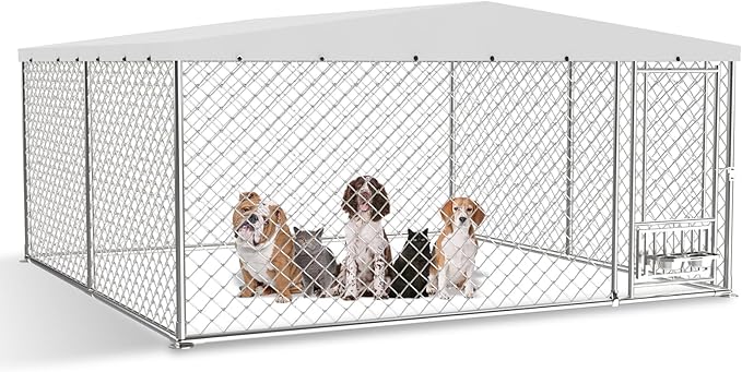 - 【Enhanced Durability】The outdoor dog kennel with roof features an upgraded structure with 1.26-inch galvanized metal tubes and 2.4mm thick steel wire mesh, delivering enhanced strength and superior rust resistance. Additional ground stakes, metal wires, and plastic zip ties effectively secure the enclosure, improving stability to create a safe and comfortable environment for your beloved pet.