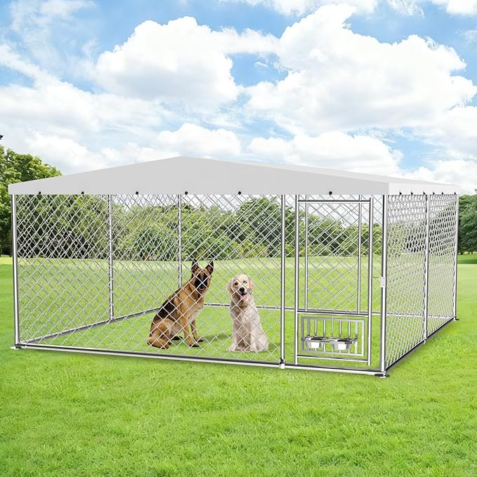 Outdoor Dog Kennel with Bowls 10x10 FT, Heavy Duty Large Outside Dog Enclosure with UV-Resistant Waterproof Sun-Proof Cover, Double Security Locks for Backyard Farm Ranch