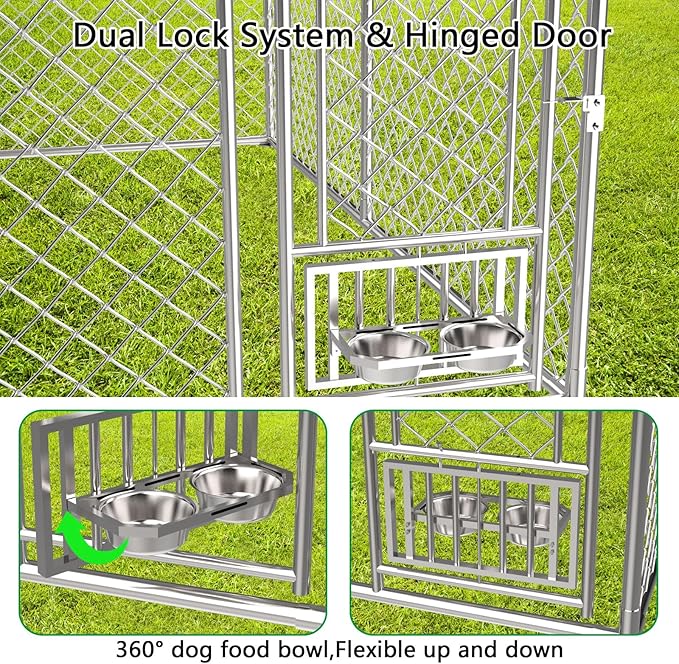 - 【Adjustable Dog Bowl】The large outdoor dog kennel features a unique rotating dog bowl, allowing you to feed your pet without entering the kennel. Additionally, the bowl's height can be adjusted according to the size of your dog, providing a convenient and hygienic feeding solution.