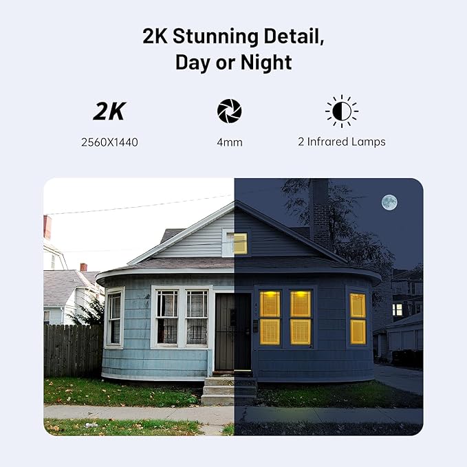 - [2K VIDEO & FULL COLOR NIGHT VISION SECURITY CAMERA] 2K super clear high quality security cameras wireless outdoor with 4mm focal length and dual light source night vision. Full color night vision and infrared night vision two options. Outstanding lens and high quality image, you won't miss a single detail even when you are away from home.