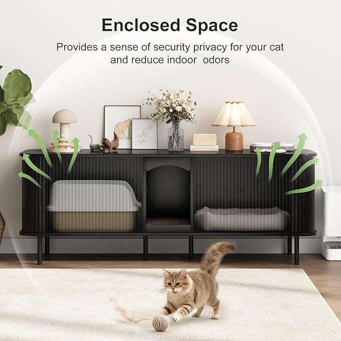 - Space-Saving Sliding Door Design | The sliding door operates smoothly without requiring extra clearance—unlike outward-swinging doors,making this large litter box cabinet ideal for apartments, corners, and tight spaces where every inch counts.