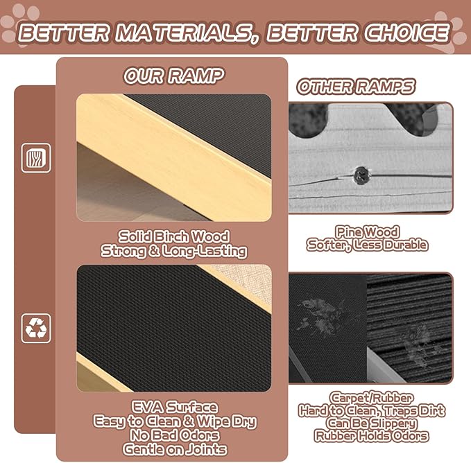 - Extra-Wide & Non-Slip Surface Your small dog will climb with confidence on this wider dog ramp for small dogs. The high-traction EVA surface provides comfort and stability, protecting joints while preventing slips. It’s also easy to clean and maintains a pet-friendly feel.