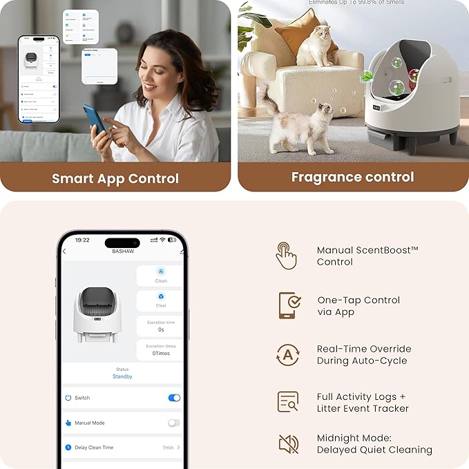 Bashaw Self Cleaning Litter Box, Automatic Cat Litter Box for Multiple Cats, App Control with Safety Sensors, Open Top, Includes Scent Cartridge, Litter Mat & 2 Roll Garbage Bags (White)