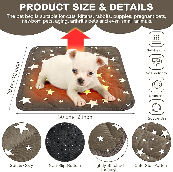 - Product Information: the package includes 4 packs of self warming cat beds with star pattern design, which can attract pets' attention easily; And the size of self heating cat pad is about 12 x 12 inches/ 30 x 30 cm, suitable for puppies, cats, kittens, rabbits, pregnant pets, newborn pets, arthritis pets and even small animals; Please measure your pet to ensure size before ordering