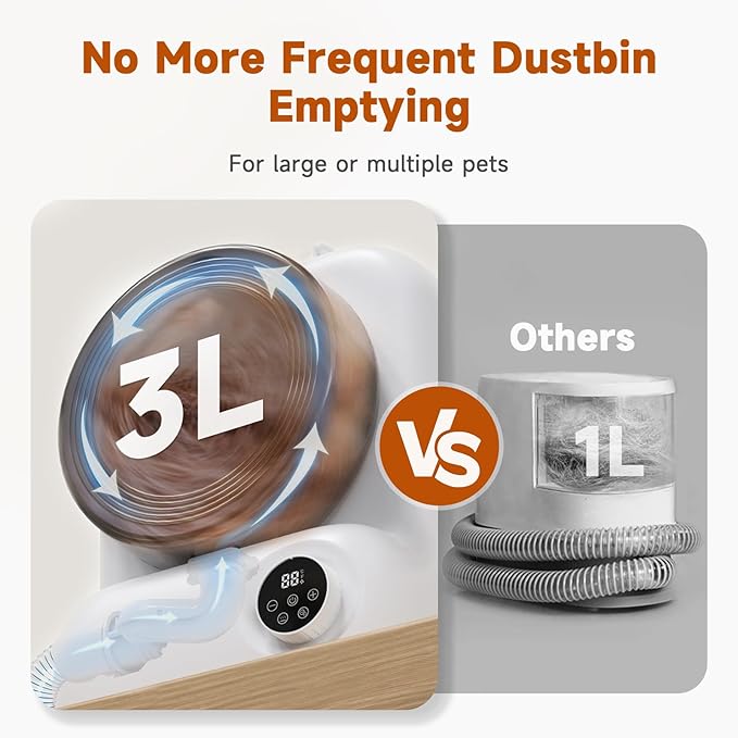 - 3L Large Dust Bin for Efficient Cleaning - The extra-large, detachable 3L dust bin of this dog hair vacuum means no need for frequent emptying during multiple pet grooming, significantly improving efficiency. The cyclonic airflow design prevents clogging, allowing you to carry out long grooming sessions effortlessly with this pet grooming vacuum for dogs.