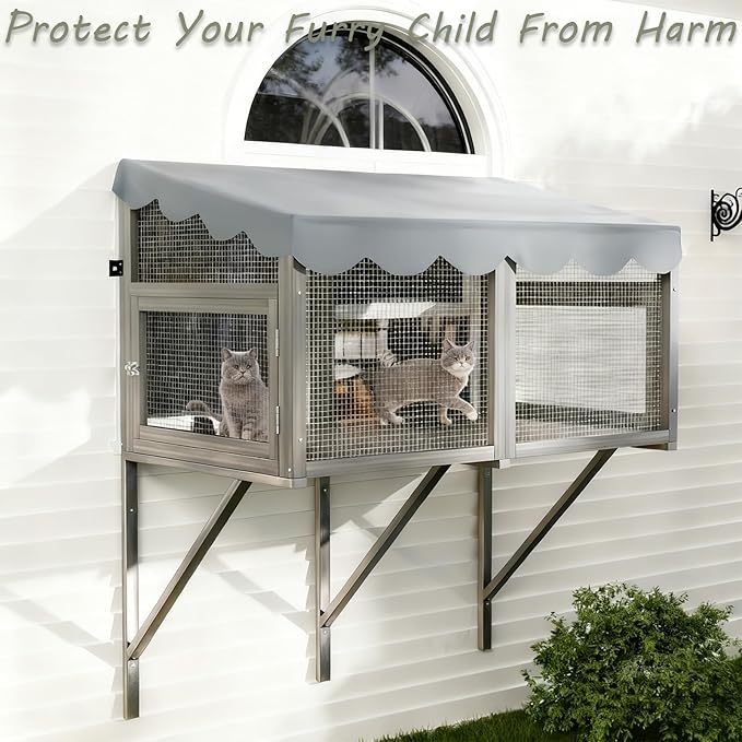 - 【Product Features】The Cat House Is Made With A 100% Solid Wood Frame And Rust-Resistant Metal Wire,And It Is Built To Last.Three Triangular Brackets Provide Excellent Support,Allowing The Entire Cat Enclosure To Be Securely Fixed To The Wall.This Cat Window Perch Provides A Waterproof Oxford Fabric Roof And A Pvc Roof.
