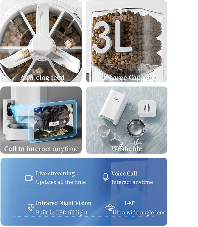 - 【✅】1080P HD Camera: This cat feeder automatic is equipped with a 1080P HD camera and a 140° wide-angle AI smart camera, allowing you to interact with your pet anytime, livestream in real time, and keep up with every moment. The infrared night vision camera has a built-in LED light, making it easy to capture your pet's activities even in the dark.【automatic cat feeder】