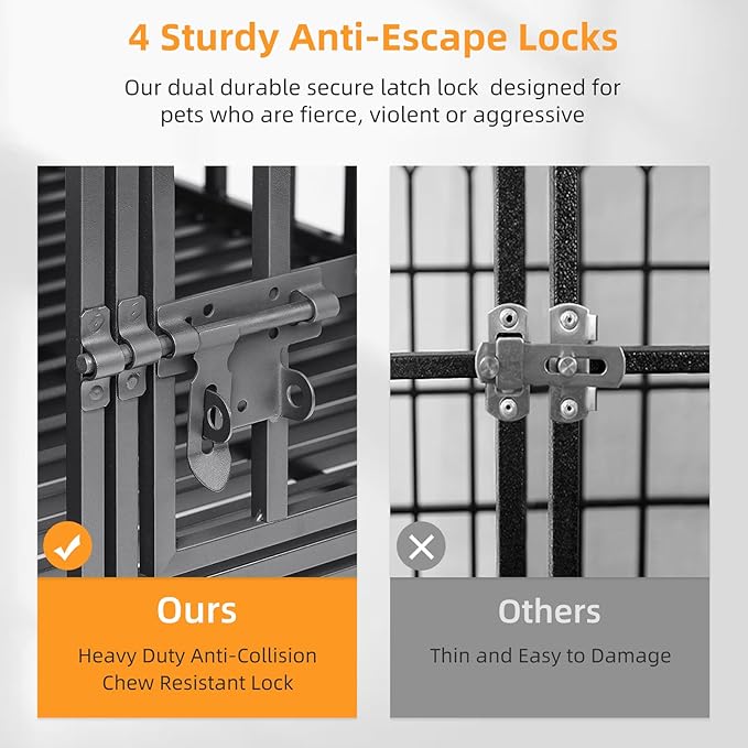 - Two Anti-Escape Locks - This heavy duty large outdoor crate is specially designed for pets with ferocious, violent or aggressive dogs, double latches prevent the dog from opening the door from the inside, and give the cage double safety locking guarantee, strong dog crate Dogs' misbehavior can be trained and corrected, each door has reinforced welding points, after long-term testing with many dogs, we designed this unique lock, which can effectively prevent them from escaping