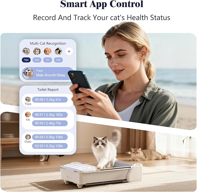 - 【Multi-Cat Management & Smart APP Control – Track Health Dynamics in Detail】 The smart APP offers all-in-one health monitoring: track your multiple cats’ litter box usage frequency, daily visits, and weight changes. Get real-time insights into your cats’ well-being at a glance. With sharing function, your family can stay informed and care for your cats remotely, ensuring continuous attention even when you're away